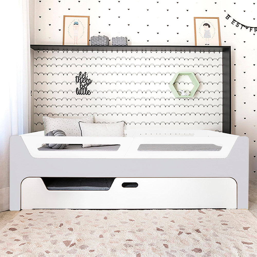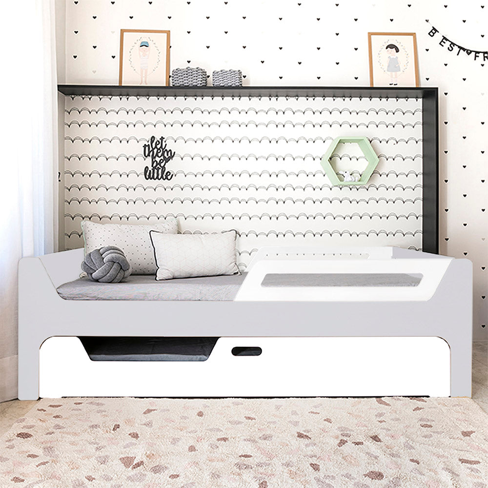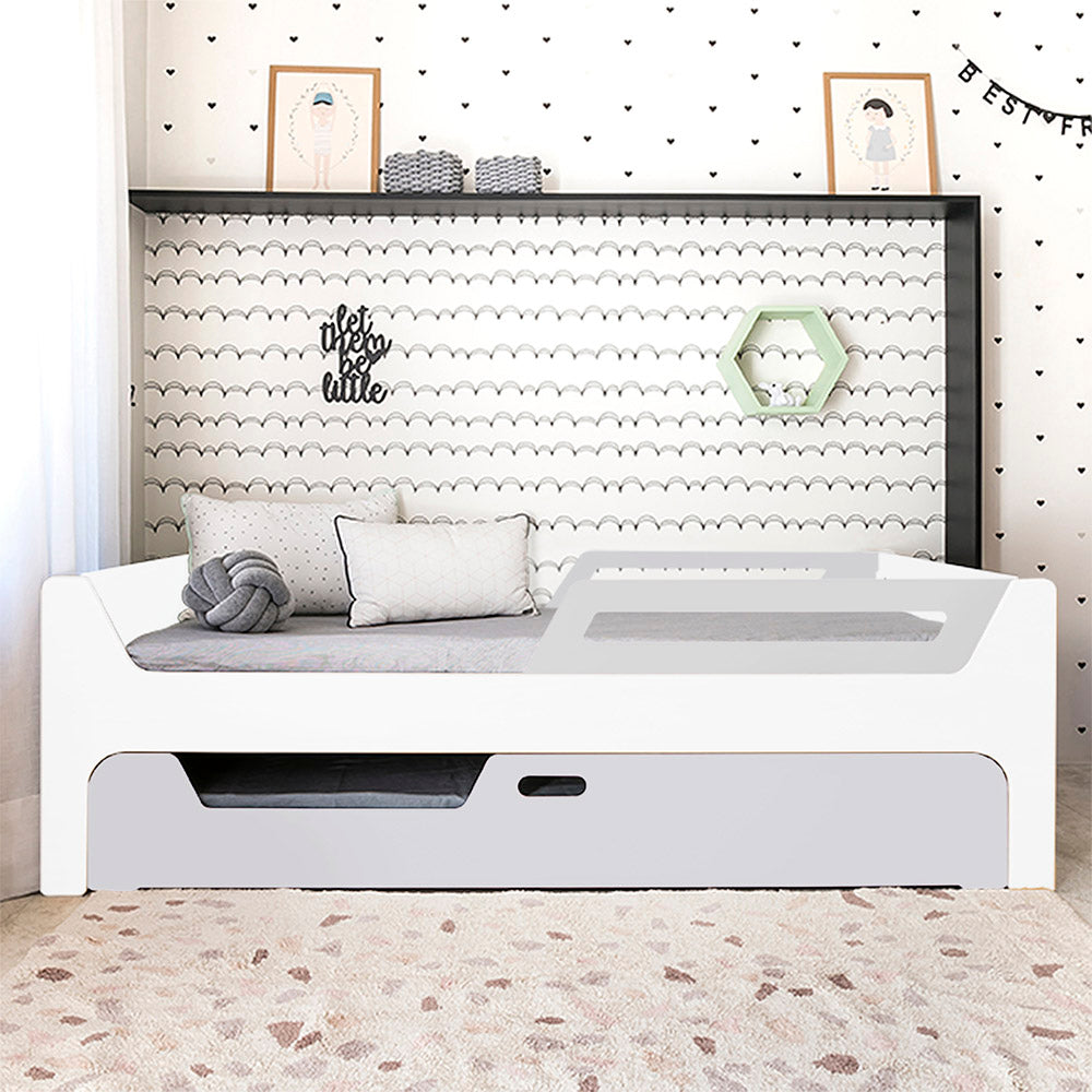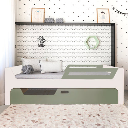 A Bicama Anis conta com duas camas com grades. A Cama superior pode receber até 4 grades removíveis. 2 na cabeceira e 2 inferiores, permitindo cinco configurações: com 4, 3, 2, 1 ou sem grades, adaptando-se às suas necessidades.