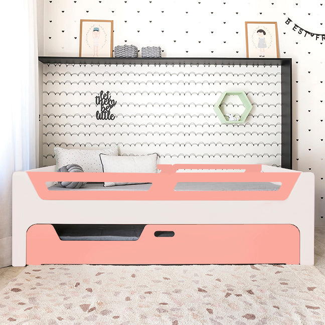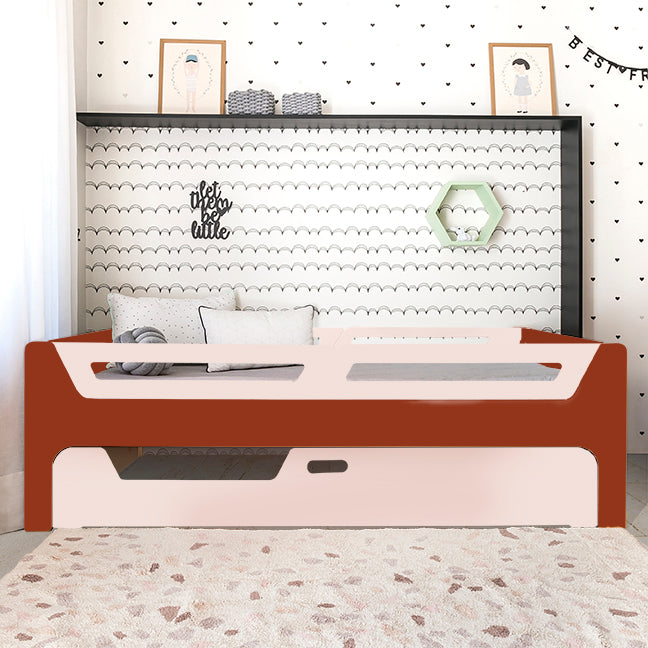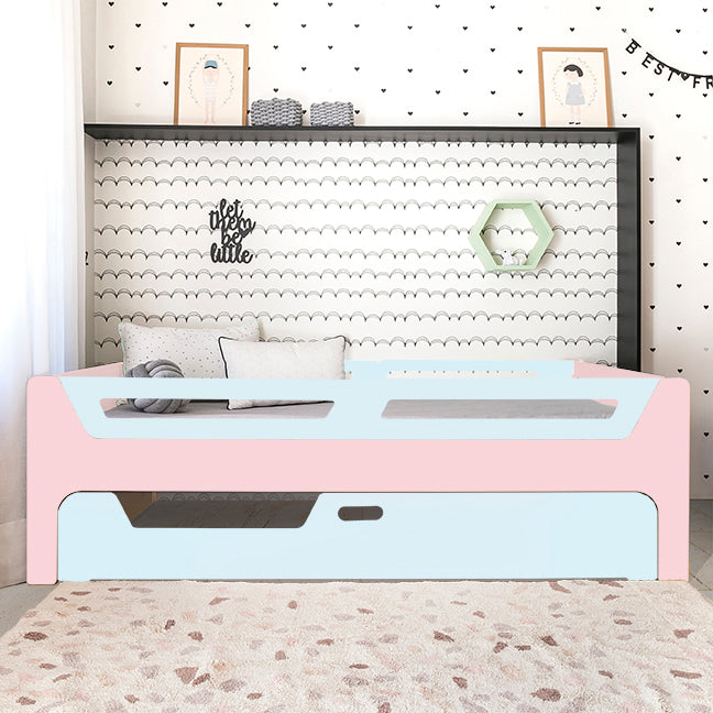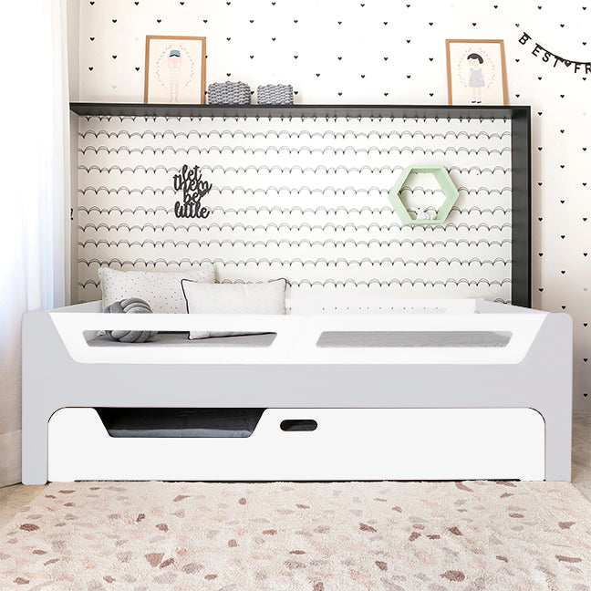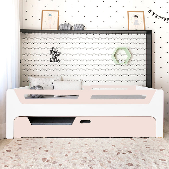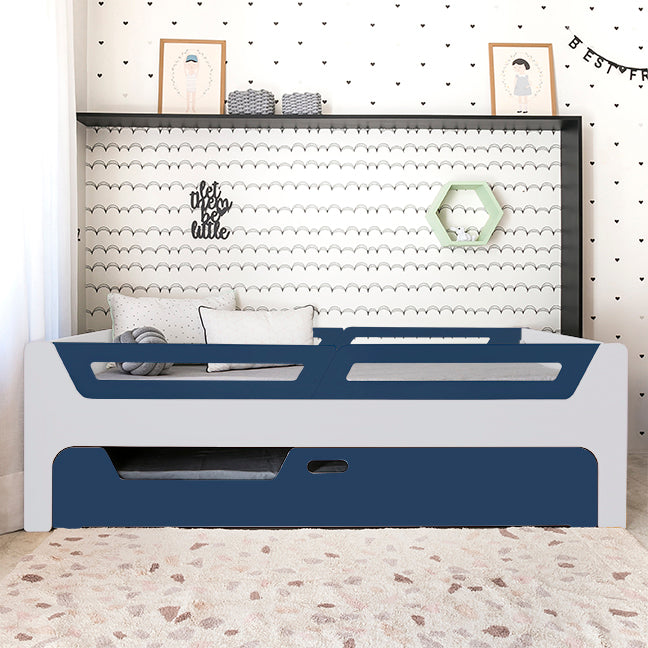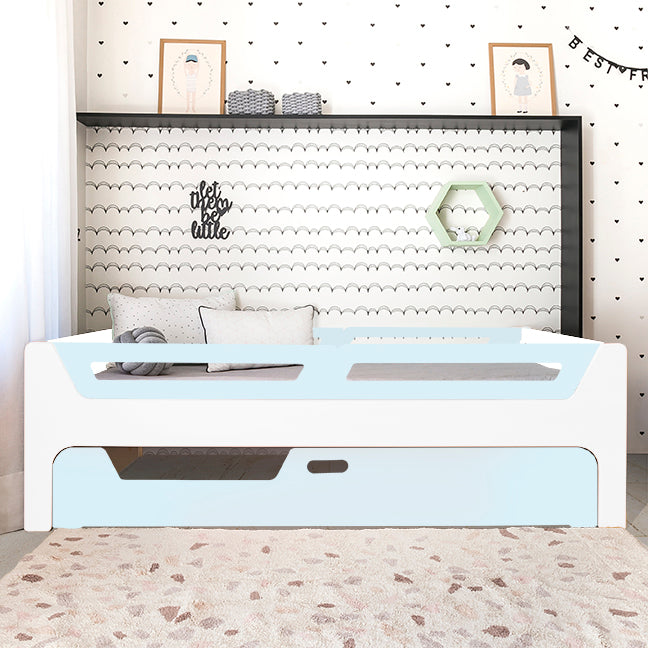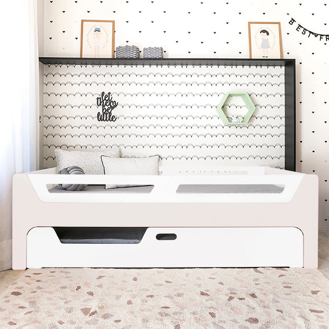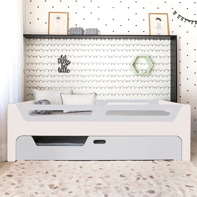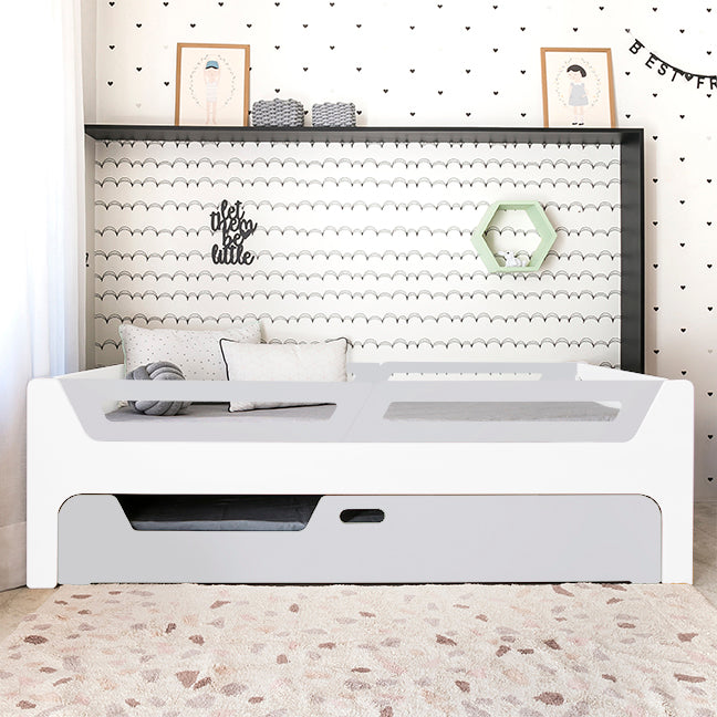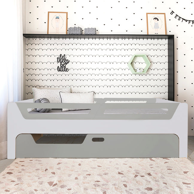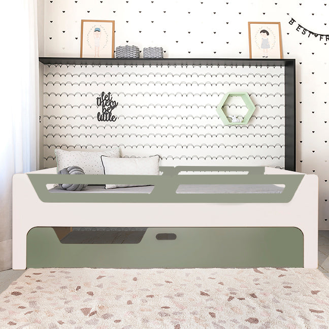 A Bicama Anis conta com duas camas com grades. A Cama superior pode receber até 4 grades removíveis. 2 na cabeceira e 2 inferiores, permitindo cinco configurações: com 4, 3, 2, 1 ou sem grades, adaptando-se às suas necessidades.