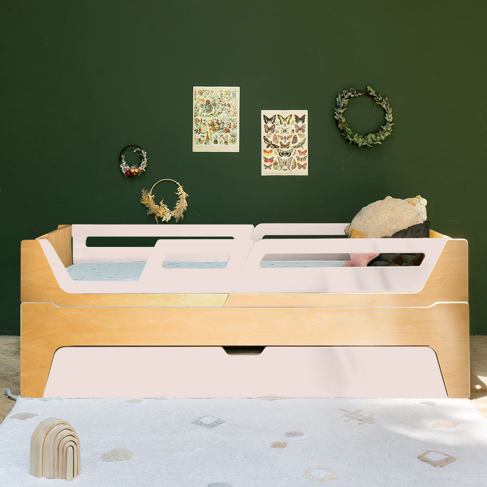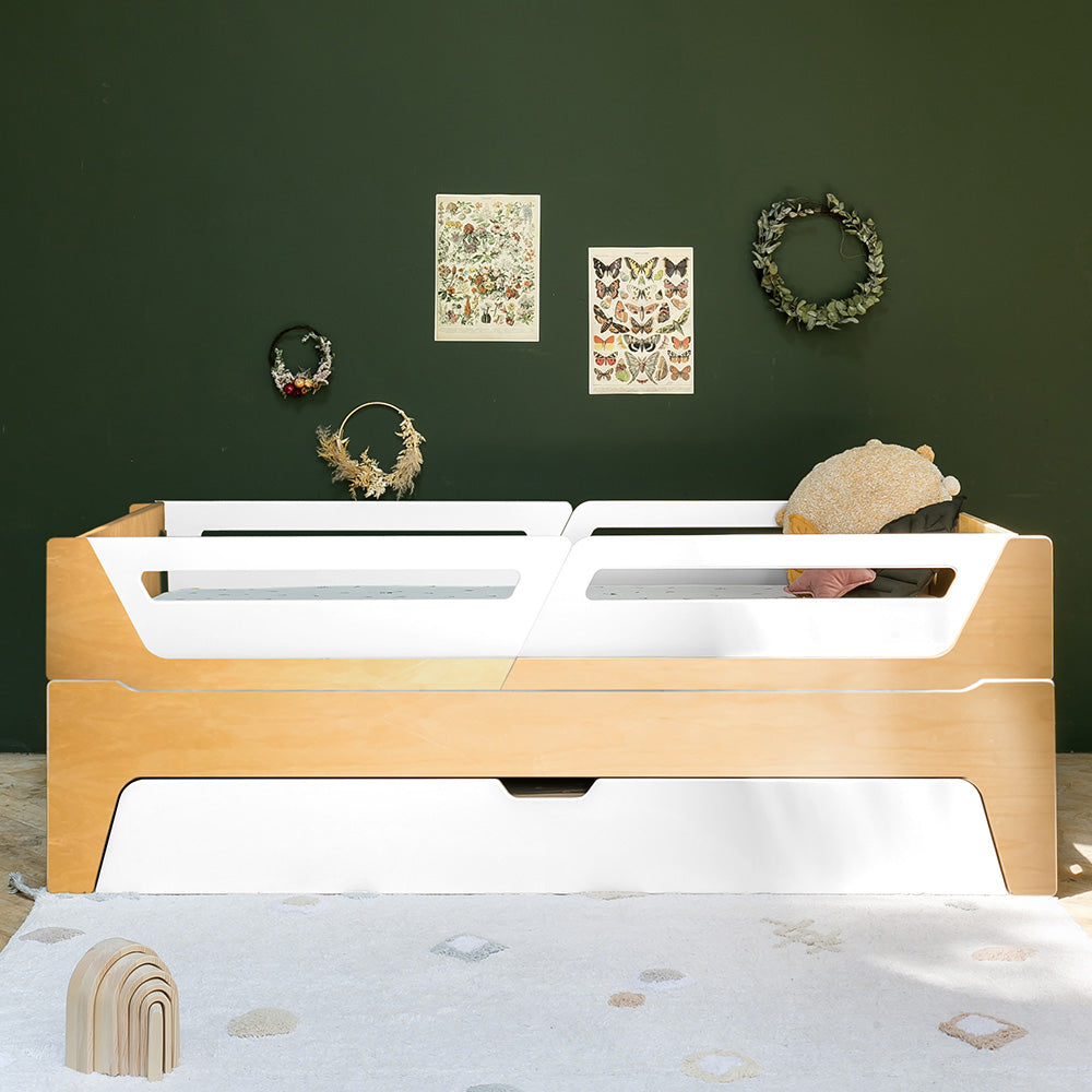 A Bicama Evolutiva Maracujá suporta até 4 grades removíveis. Pode ser usada na versão baixa ou alta, com altura padrão. Na posição alta, recebe cama auxiliar e vira bicama. Grades da versão baixa podem ser reaproveitadas com kits. Versátil e prática para acompanhar o crescimento.